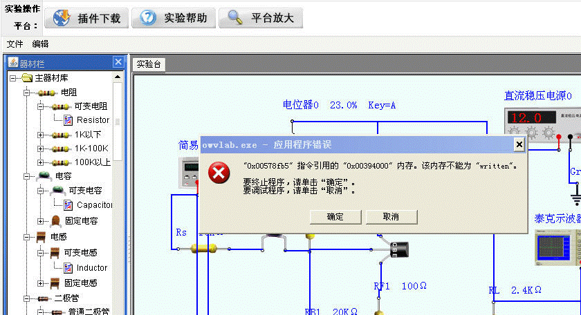杀毒软件认为owvlab.exe不安全而阻止虚拟实验平台的调用,最终导致测量仪表的结果显示为0.0,或者示波器无波形显示。