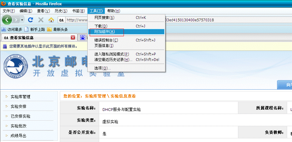 答:这是因为火狐浏览器禁用课程模拟插件所导致的,只要打开火狐浏览器附加组件即可解决,具体步骤如下:
