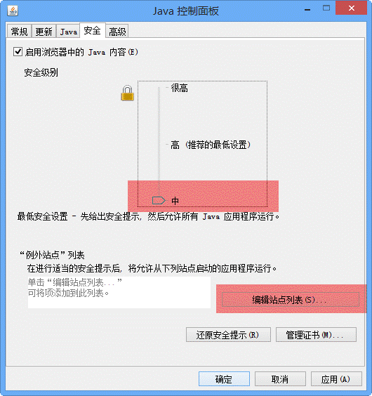 解决方法:进入控制面板——》程序——》Java——》安全,把安全等级也调到最低。如下图所示: