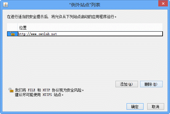 解决方法2:进入控制面板——》程序——》Java——》安全,在例外站点里把您访问的