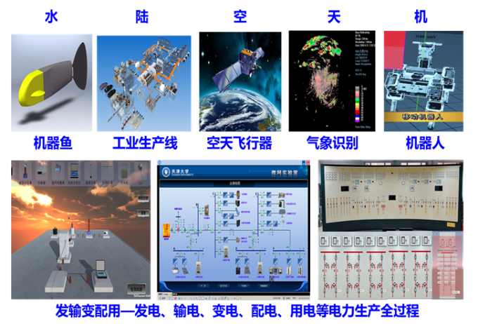 中心的虚拟教学资源非常丰富,涉及水(机器鱼)、陆(工业生产线)、空(空天飞行器)、天(气象识别)、机(机器人),以及电力系统的发(发电)、输(输电)、变(变电)、配(配电)、用(用电)等电力生产全过程,如下图所示。